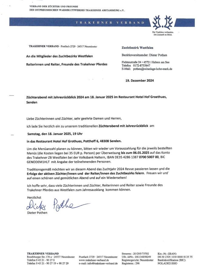 bald ist es wieder soweit: unser Züchterabend mit Jahresrückblick 2024 im ZB Westfalen findet am 18. Januar 2025 in Senden statt